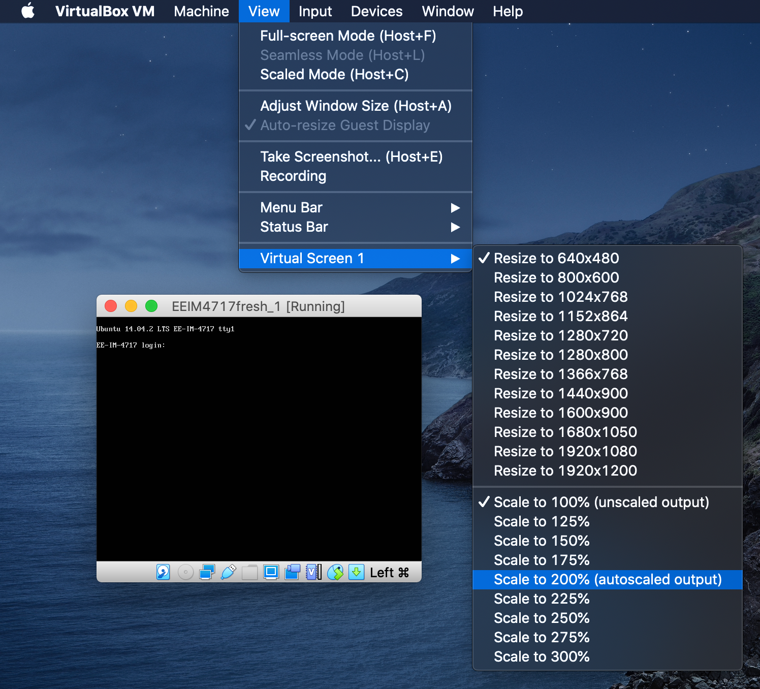 With the virtual machine in focus, click on the View → Virtual Screen 1 → Scale to 200% to scale it up.