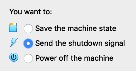 When you press the close button of the virtual machine, you can pick among the following options as shown in the image on the right. Select the Send the shutdown signal option in order to shut it down properly.